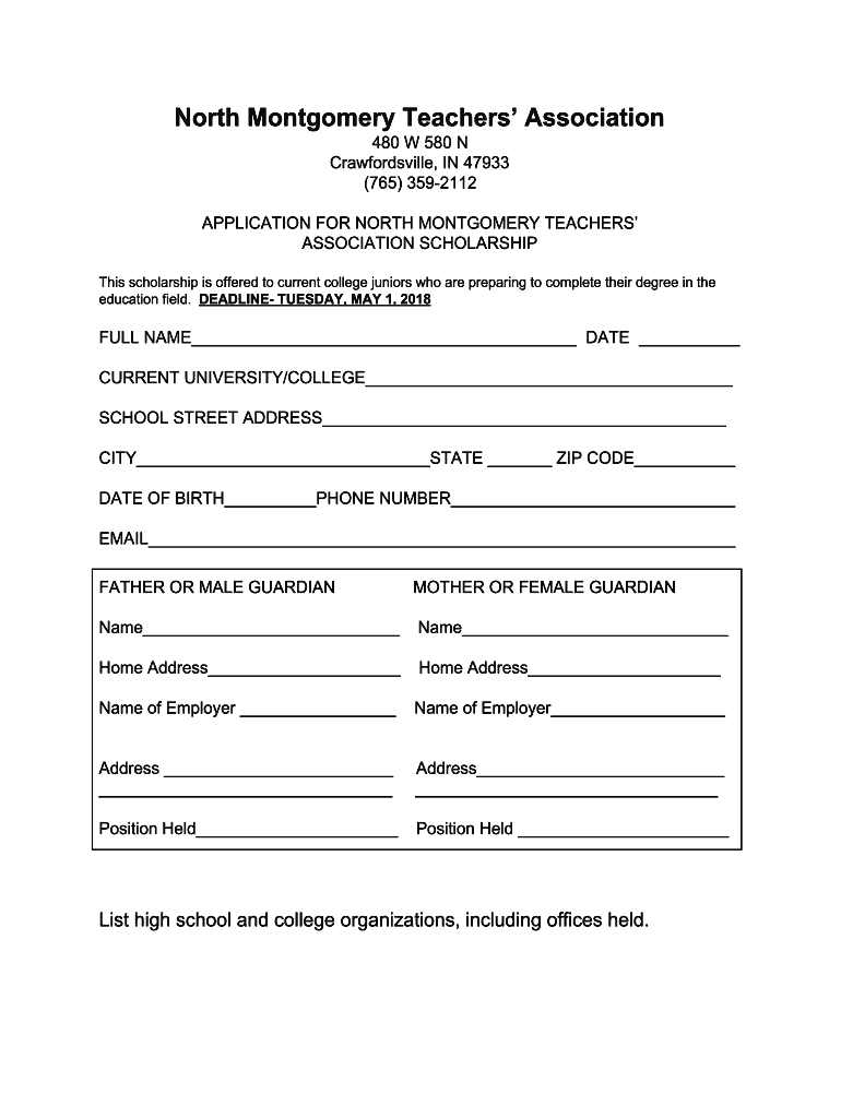 North Montgomery Teachers Association 480 W 580 N Crawfordsville, IN 47933 (765) 3592112 APPLICATION FOR NORTH MONTGOMERY TEACHERS ASSOCIATION SCHOLARSHIP This scholarship is offered to current college