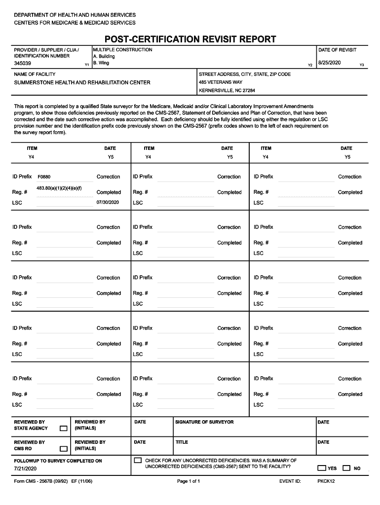 DEPARTMENT OF HEALTH AND HUMAN SERVICES CENTERS FOR MEDICARE & MEDICAID SERVICESPOSTCERTIFICATION REVISIT REPORT PROVIDER / SUPPLIER / CIA / IDENTIFICATION NUMBER345039Y1MULTIPLE CONSTRUCTION A. Building