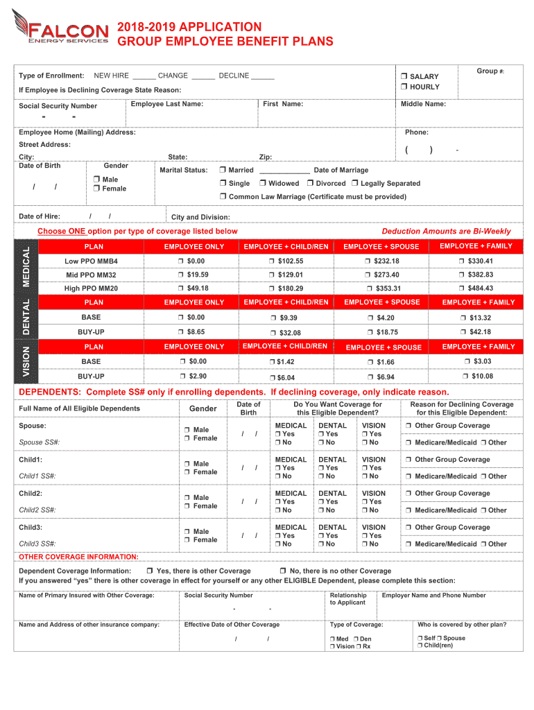 20182019 APPLICATION GROUP EMPLOYEE BENEFIT PLANS If Employee is Declining Coverage State Reason: Employee Last Name: Social Security Number Group #: SALARY HOURLYType of Enrollment: NEW HIRE CHANGE