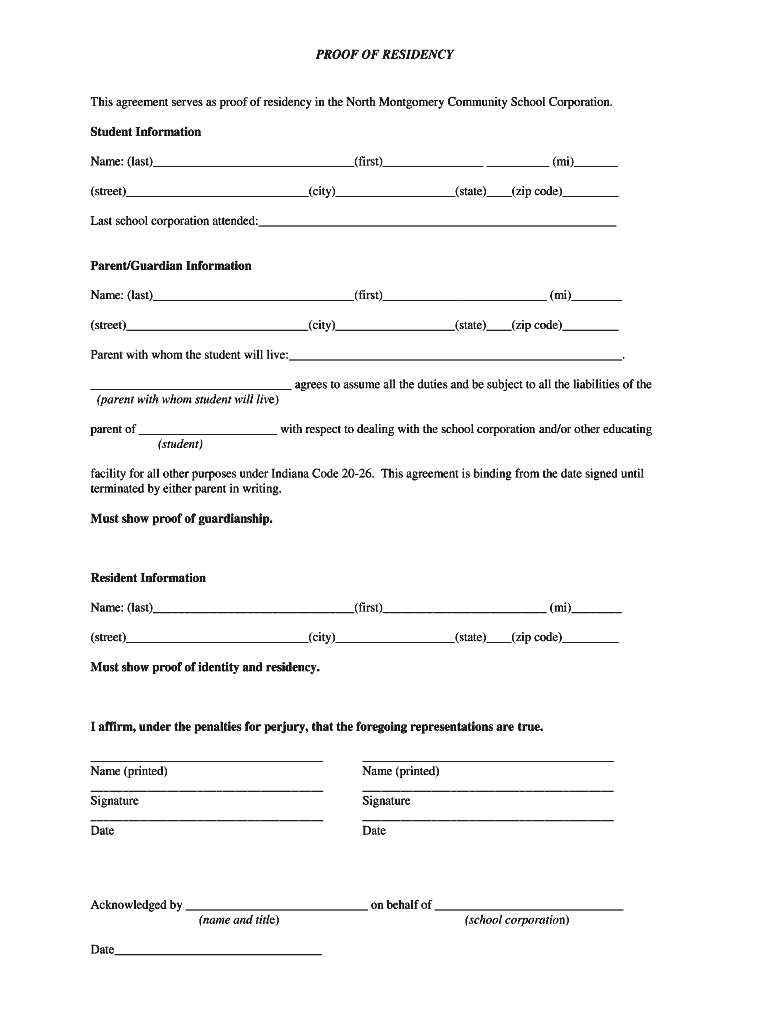 PROOF OF RESIDENCYThis agreement serves as proof of residency in the North Montgomery Community School Corporation. Student Information Name: (last) (first) (me) (street) (city) (state) (zip code)