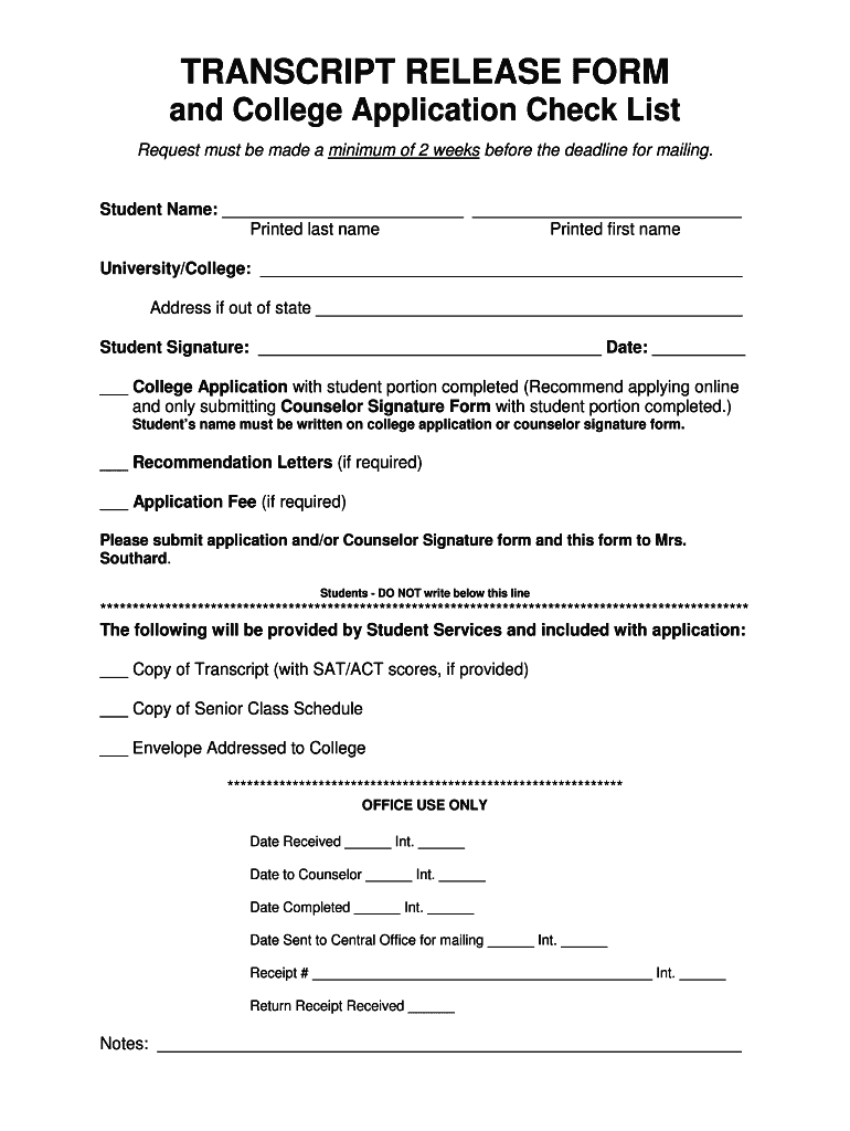 TRANSCRIPT RELEASE FORM and College Application Check List Request must be made a minimum of 2 weeks before the deadline for mailing. Student Name: Printed last name Printed first name University/College: