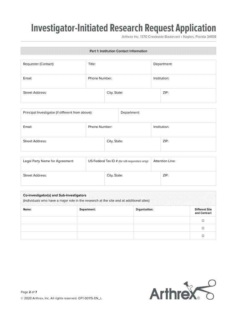 InvestigatorInitiated Research Request Application Anthrax Inc. 1370 Creekside Boulevard Naples, Florida 34108Arthrex provides funding for independent research activities that are aligned with our