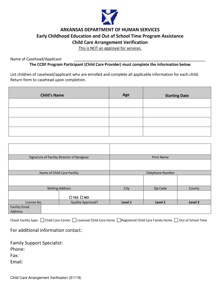 ARKANSAS DEPARTMENT OF HUMAN SERVICES Early Childhood Education and Out of School Time Program Assistance Child Care Arrangement Verification This is NOT an approval for services. Name of Case head/Applicant
