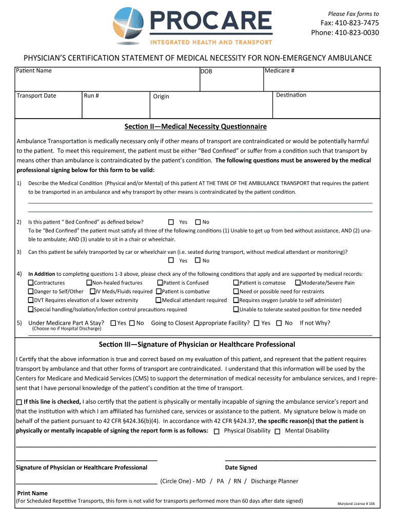 Phone: 4108230030PHYSICIANS CERTIFICATION STATEMENT OF MEDICAL NECESSITY FOR EMERGENCY AMBULANCE