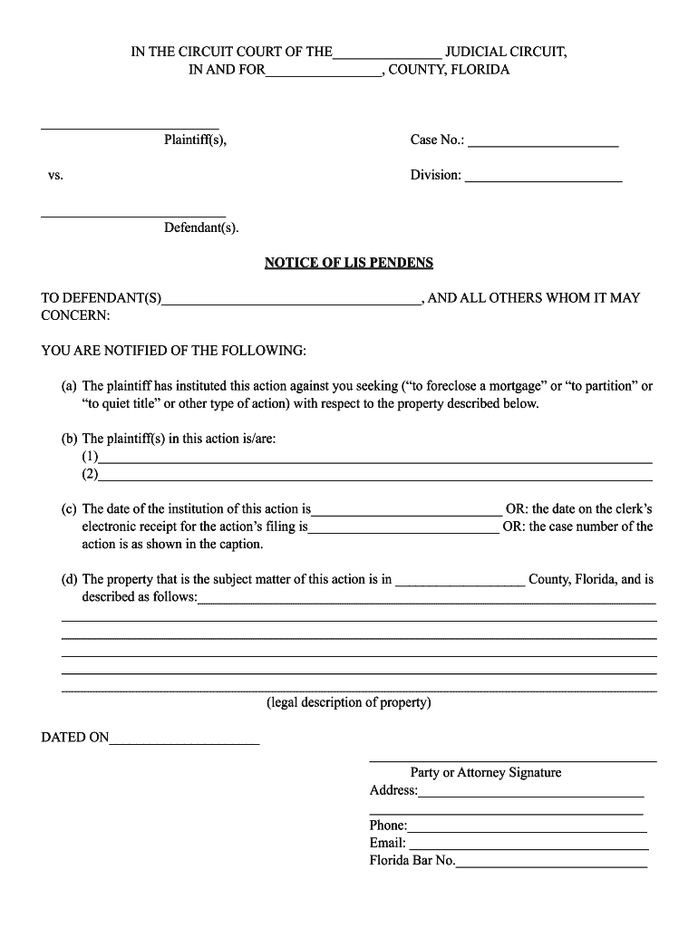 IN THE CIRCUIT COURT OF THE JUDICIAL CIRCUIT, IN AND FOR, COUNTY, FLORIDA Plaintiff(s), Case No.: vs. Division: Defendant(s). NOTICE OF IS PENDENT TO DEFENDANT(S), AND ALL OTHERS WHOM IT MAY CONCERN:
