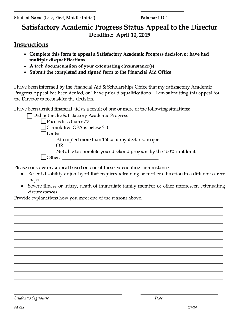Financial Aid, Veterans & Scholarship Services Satisfactory Academic Progress Appeal to the Director Deadline: April 10, 2015, According to our records you are not eligible for Federal Financial Aid
