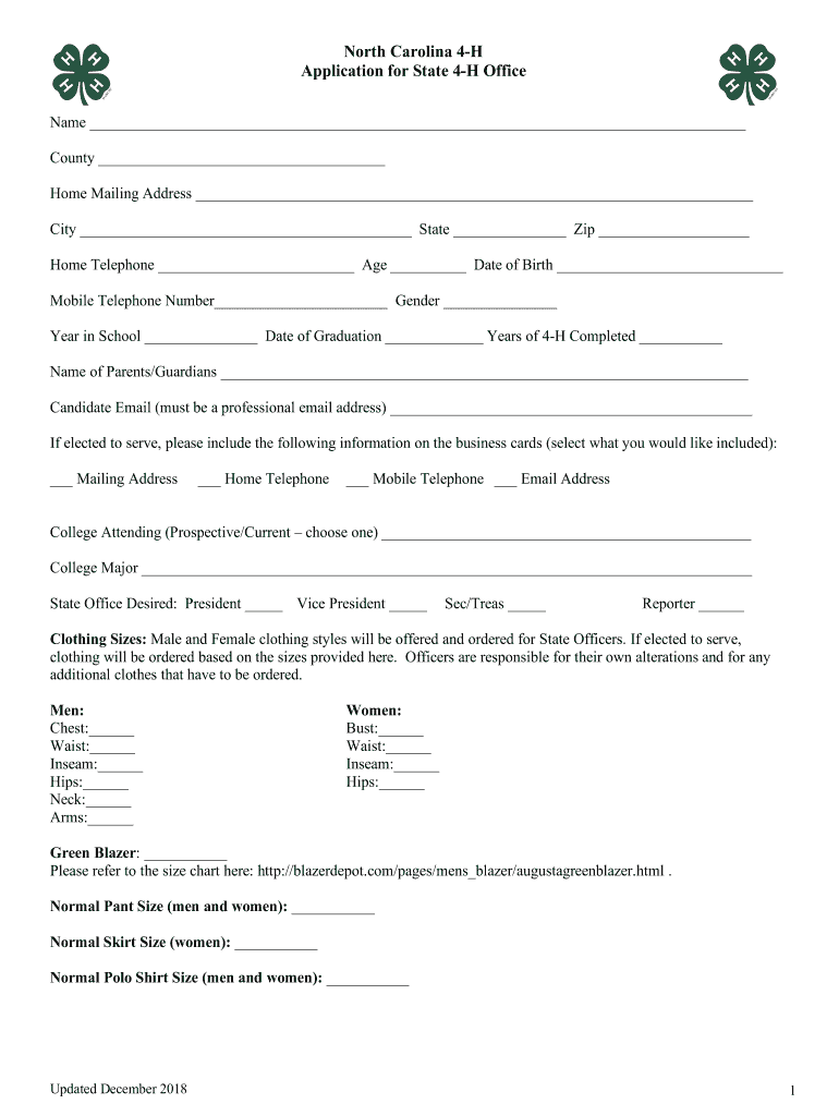 North Carolina 4H Application for State 4H Office Name County Home Mailing Address City State Zip Home Telephone Age Date of Birth Mobile Telephone Number Gender Year in School Date of Graduation