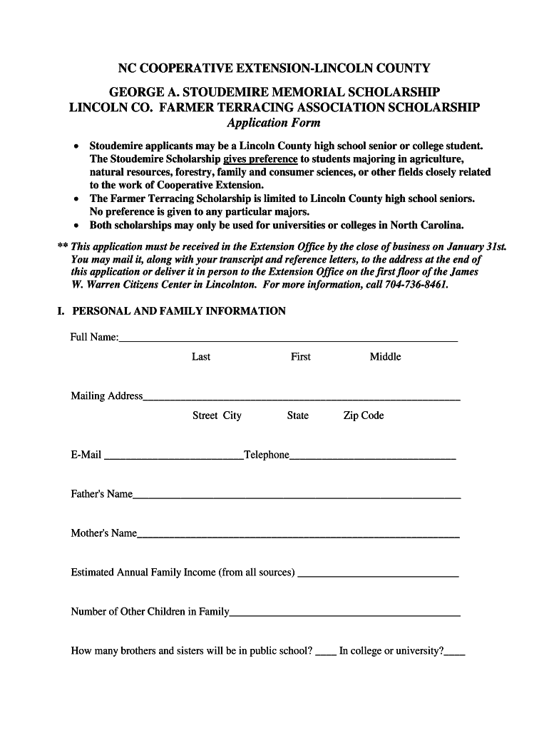 NC COOPERATIVE EXTENSIONLINCOLN COUNTY GEORGE A. STOUDEMIRE MEMORIAL SCHOLARSHIP LINCOLN CO. FARMER TERRACING ASSOCIATION SCHOLARSHIP Application Form Stoudemire applicants may be a Lincoln County