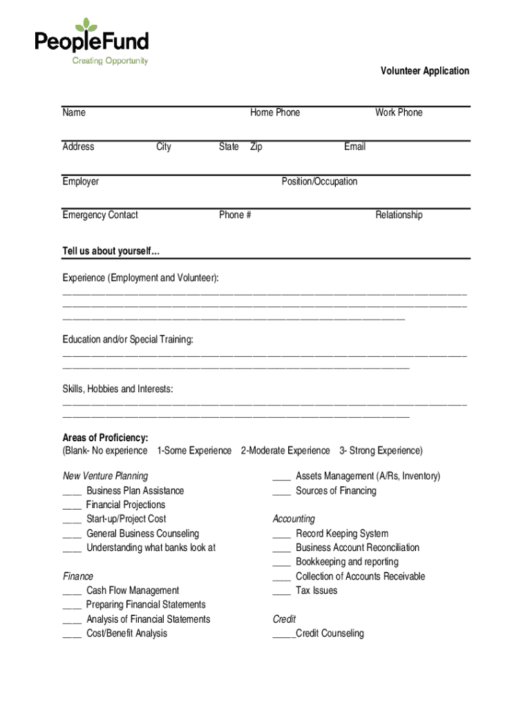 The Volunteer Application Form is essential for individuals looking to apply for volunteer positions with PeopleFund. This form serves as a crucial tool in volunteer recruitment, allowing organizations to gather vital information about applicants.