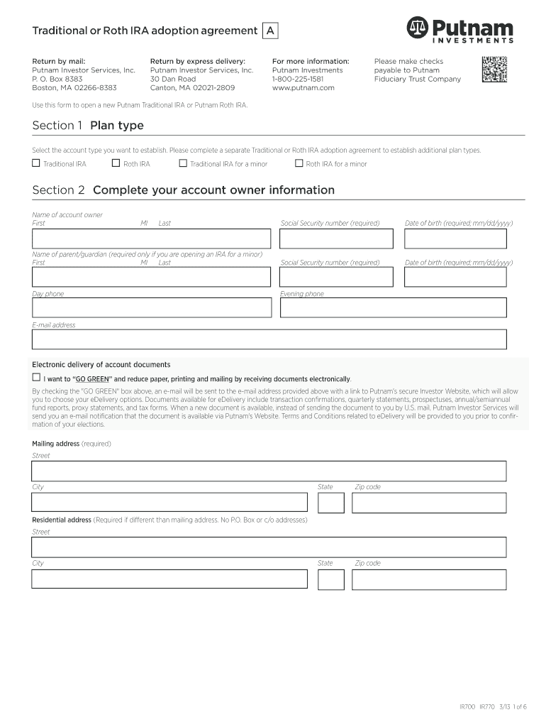 IR700 IR770 09/16 1 of 7. Electronic ... Use this form to open a new Putnam Traditional IRA or Putnam Roth IRA. Section 1 .... Please use the Putnam Fund Guide (https://www.putnam.com/literature/pdf/FM103.pdf)
