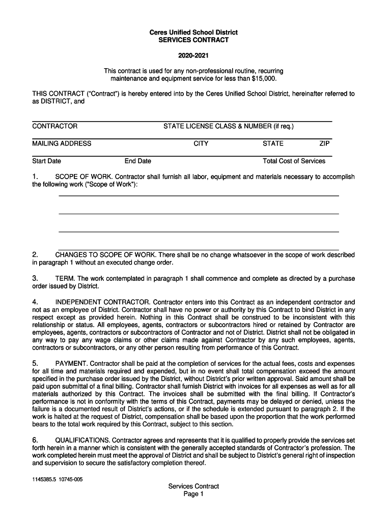 Ceres Unified School District SERVICES CONTRACT 20202021 This contract is used for any nonprofessional routine, recurring maintenance and equipment service for less than $15,000. THIS CONTRACT (Contract)