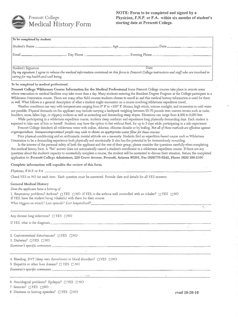 NOTE: Form to be completed and signed by a Physician, F.N.P. or P.A. within six months of student's starting date at Prescott College. Prescott CollegeMedical History Form To be completed by student.