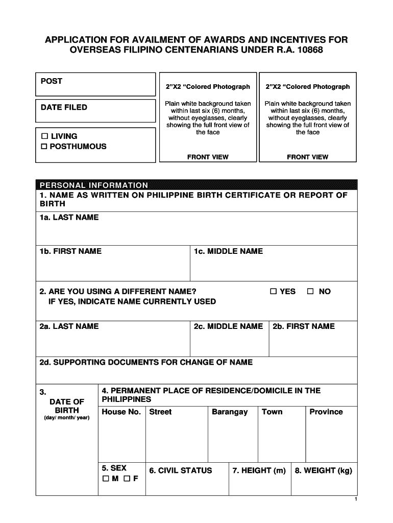 APPLICATION FOR AILMENT OF AWARDS AND INCENTIVES FOR OVERSEAS FILIPINO CENTENARIANS UNDER R.A. 10868POSTDATE FILED LIVING POSTHUMOUS2X2 Colored Photograph2X2 Colored PhotographPlain white background