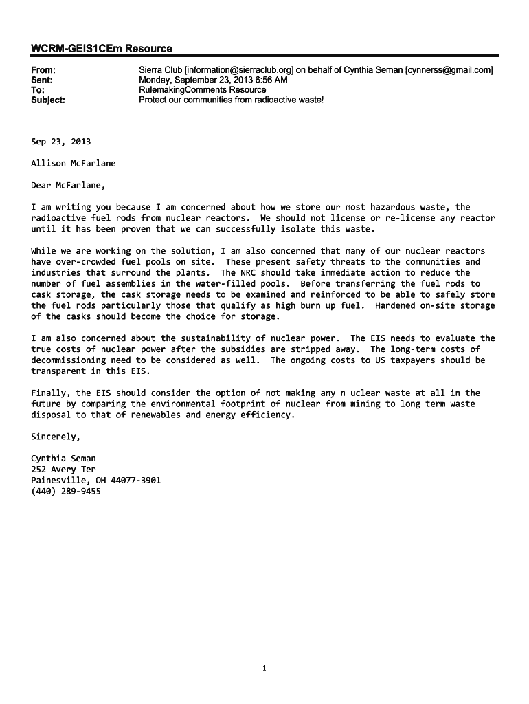 WCRMGEIS1CEm Resource From: Sent: To: Subject:Sierra Club information sierra club.org on behalf of Cynthia Sean Congress gmail.com Monday, September 23, 2013 6:56 AM RulemakingComments Resource Protect