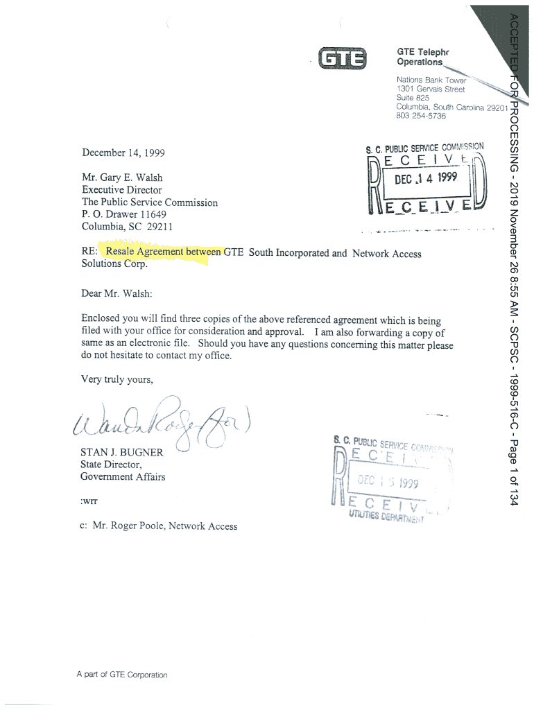 Operations Nations Bank Tower 1301 Gervais Street Suite 825 Columbia, South Carolina 29201 803 2545736December 14, 1999COMMISSION S. C. PUBLIC SERVICE “03Mr. Gary E. Walsh Executive Director The