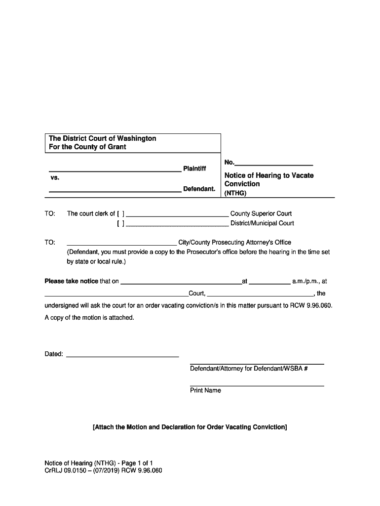 The District Court of Washington For the County of Grant No. Plaintiff vs. Defendant.TO:Notice of Hearing to Vacate Conviction (NTH)The court clerk of County Superior Court District/Municipal Court