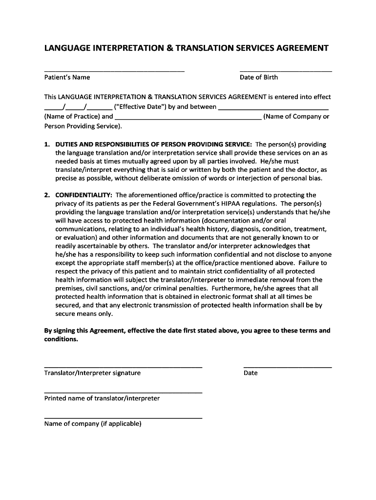 LANGUAGE INTERPRETATION & TRANSLATION SERVICES AGREEMENT Patients Name Date of Births LANGUAGE INTERPRETATION & TRANSLATION SERVICES AGREEMENT is entered into effect / / (“Effective Date “) by