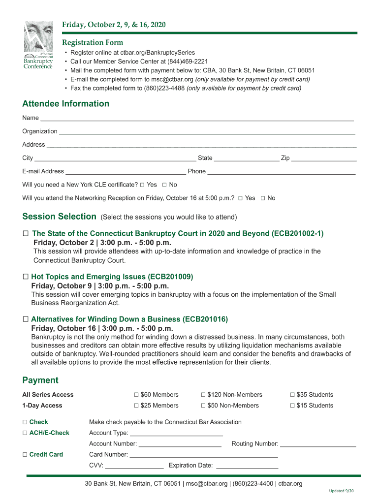 Friday, October 2, 9, & 16, 2020 Registration Form Register online at ctbar.org/BankruptcySeries Call our Member Service Center at (844)4692221 Mail the completed form with payment below to: CBA,