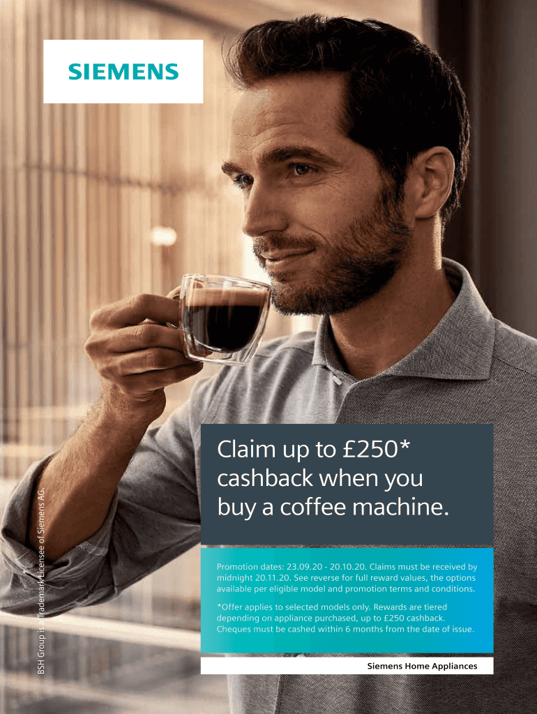BSH Group is a Trademark Licensee of Siemens AG. Claim up to 250* cashback when you buy a coffee machine. Promotion dates: 23.09.20 20.10.20. Claims must be received by midnight 20.11.20. See reverse