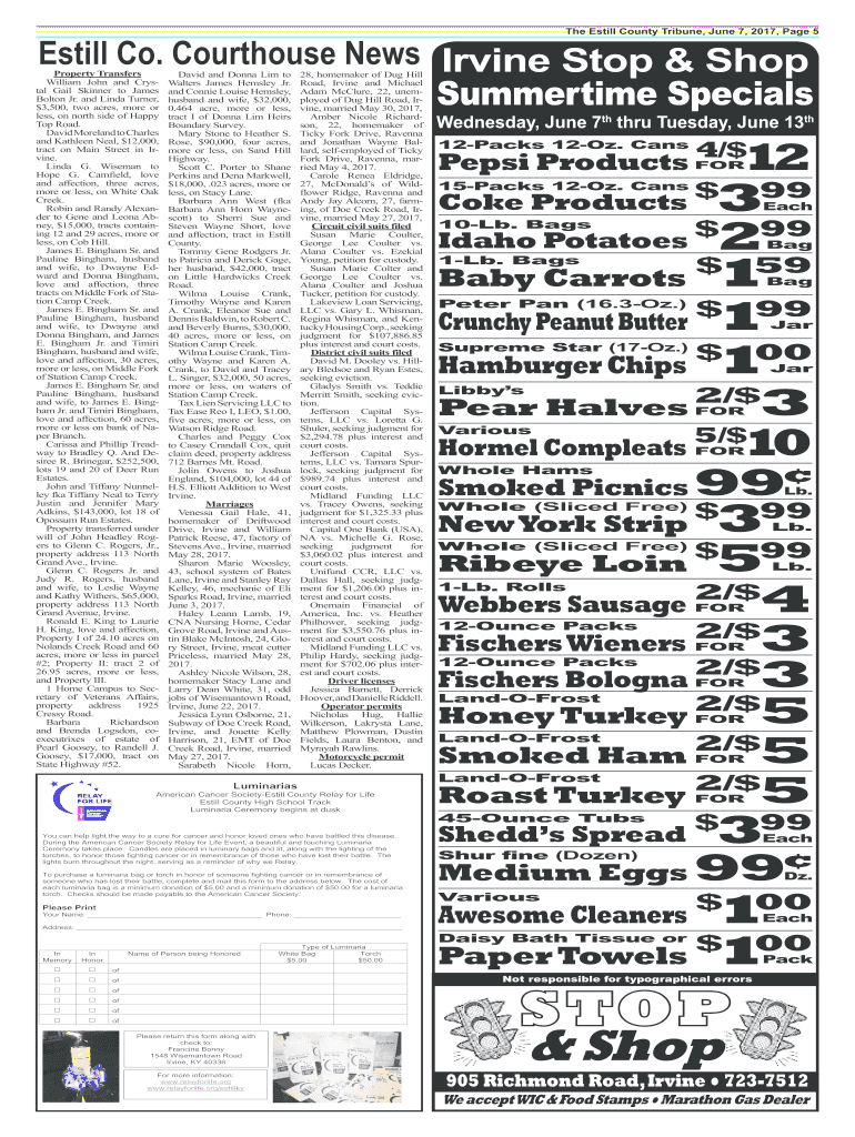 The Still County Tribune, June 7, 2017, Page 5Estill Co. Courthouse News Irvine Stop & Shop Summer Specials Wednesday, June 7 through Tuesday, June 13Property Transfers William John and Crystal Gail
