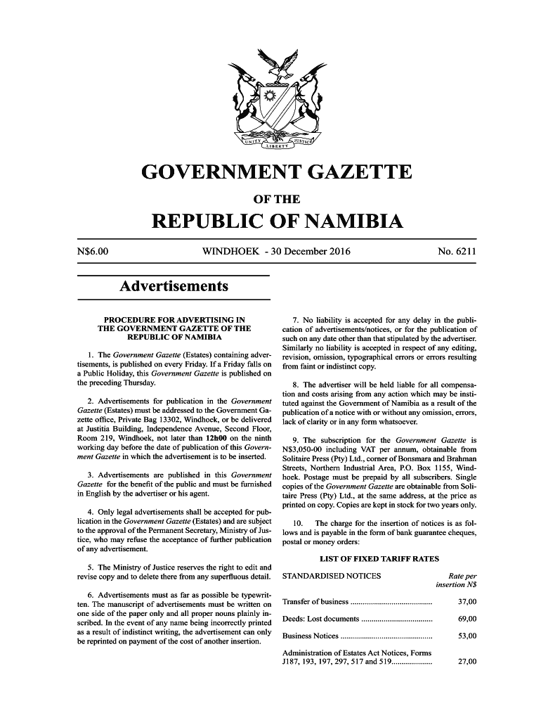 GOVERNMENT GAZETTE OF REPUBLIC OF NAMIBIA N$6.00WINDHOEK 30 December 2016 No. 6211Advertisements PROCEDURE FOR ADVERTISING IN THE GOVERNMENT GAZETTE OF THE REPUBLIC OF NAMIBIA1. The Government Gazette