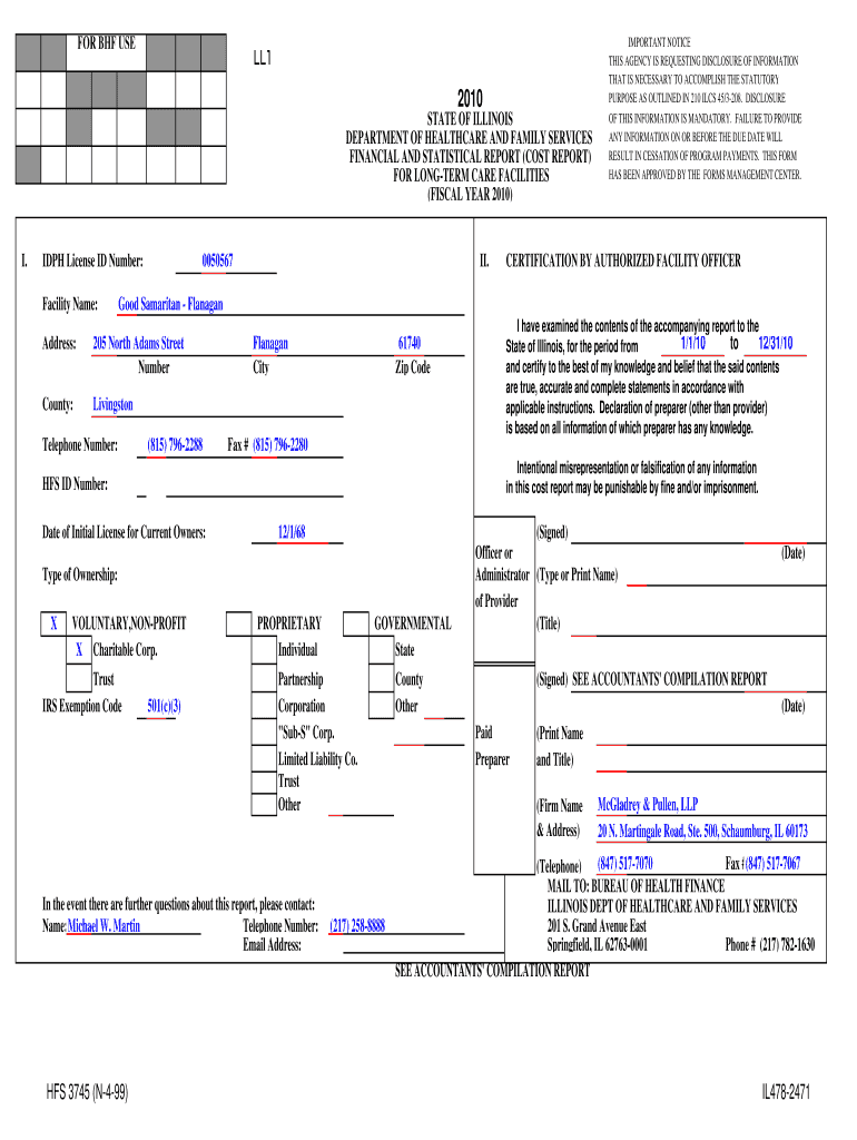 FOR BHF USELL1 2010 STATE OF ILLINOIS DEPARTMENT OF HEALTHCARE AND FAMILY SERVICES FINANCIAL AND STATISTICAL REPORT (COST REPORT) FOR LONGER CARE FACILITIES (FISCAL YEAR 2010)I.DPH License ID Number: