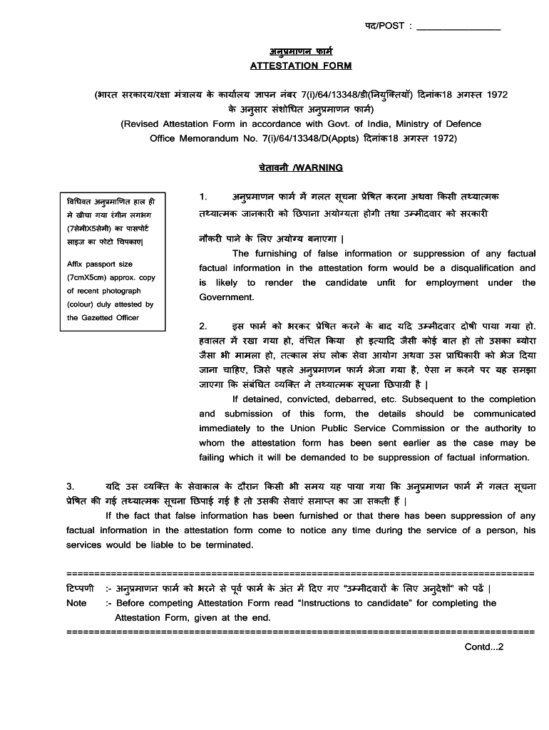 /POST : ATTESTATION FORM (/ 7(i)/64/13348/() 18 1972)(Revised Attestation Form in accordance with Govt. of India, Ministry of Defense Office Memorandum No