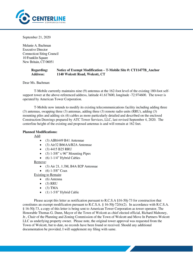 September 21, 2020, Melanie A. Bach man Executive Director Connecticut Siting Council 10 Franklin Square New Britain, CT 06051 Regarding: Address:Notice of Exempt Modification Mobile Site #: CT11477B