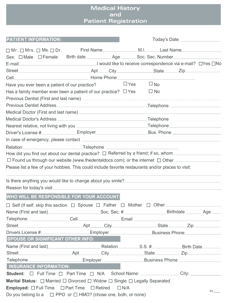 Medical History and Patient Registration PATIENT INFORMATION: Mr. Mrs. Ms. Dr. Sex: Male Email Street FemaleToday's Date M.I. First Name Last Name Birth date Age Soc. Sec. Number I would like to receive