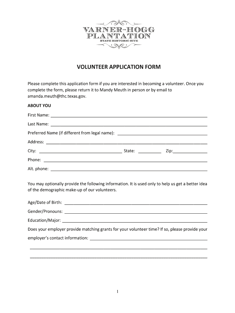 VOLUNTEER APPLICATION FORM Please complete this application form if you are interested in becoming a volunteer. Once you complete the form, please return it to Mandy Mouth in person or by email to