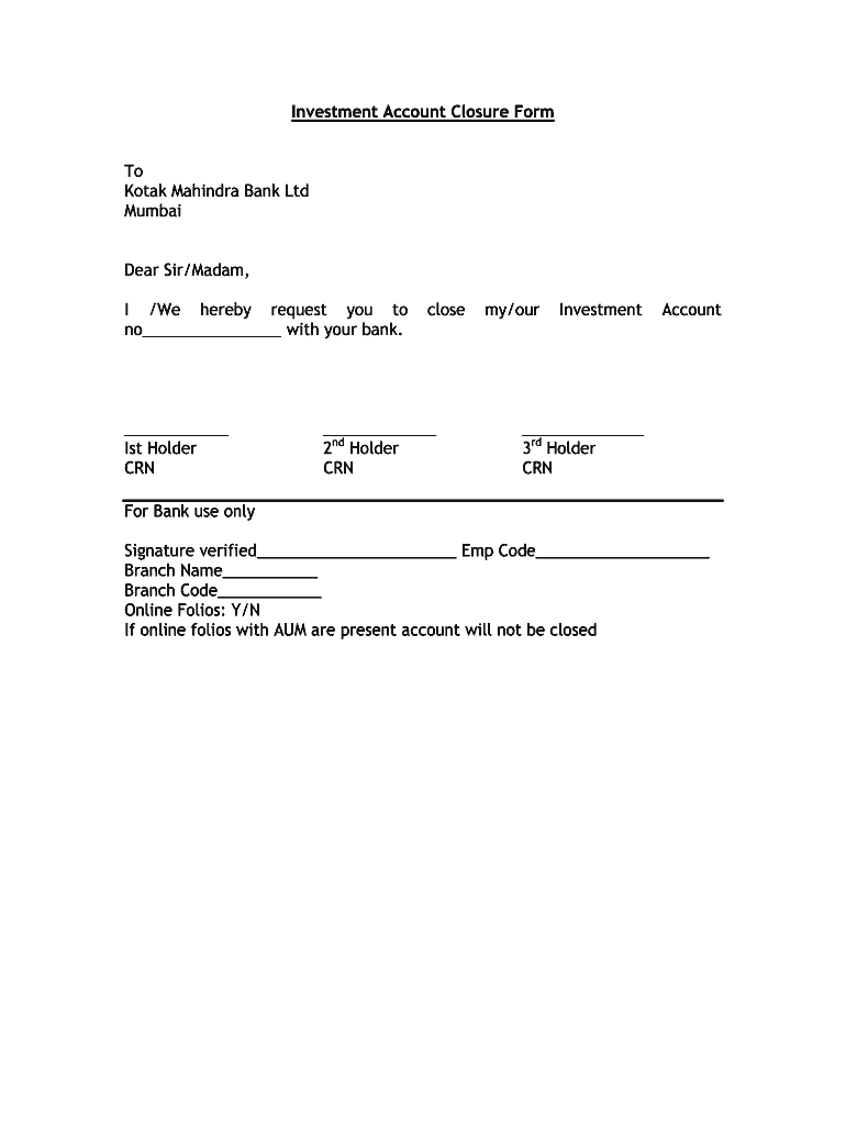 Investment Account Closure Form Kotak Mahindra Bank Ltd Bombardier Sir/Madam, I /We hereby request you to now with your bank. IST Holder CRN close 2nd Holder CRN my/ourInvestmentAccount 3rd Holder