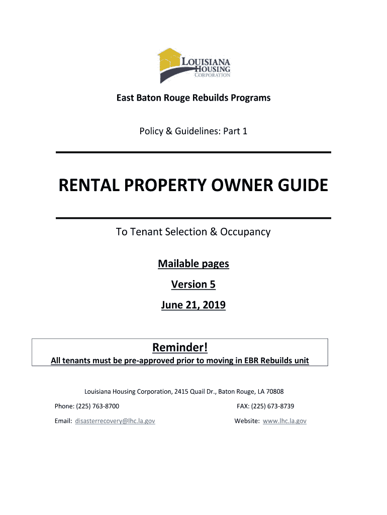 East Baton Rouge Rebuilds Programs Policy & Guidelines: Part 1RENTAL PROPERTY OWNER GUIDE To Tenant Selection & Occupancy Bailable pages Version 5 June 21, 2019Reminder! All tenants must be preapproved