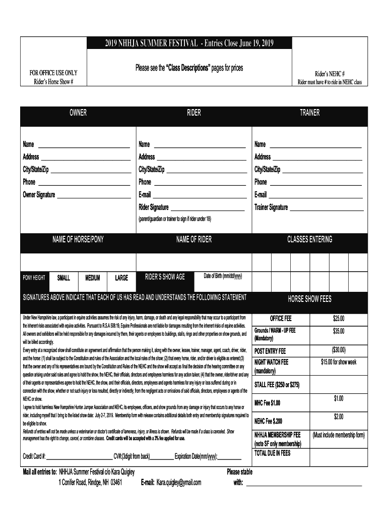2019 NINJA SUMMER FESTIVAL Entries Close June 19, 2019, Please see the Class Descriptions pages for processor OFFICE USE ONLY Riders Horse Show #Riders NEC # Rider must have # to ride in NEC classOWNERRIDERTRAINERName