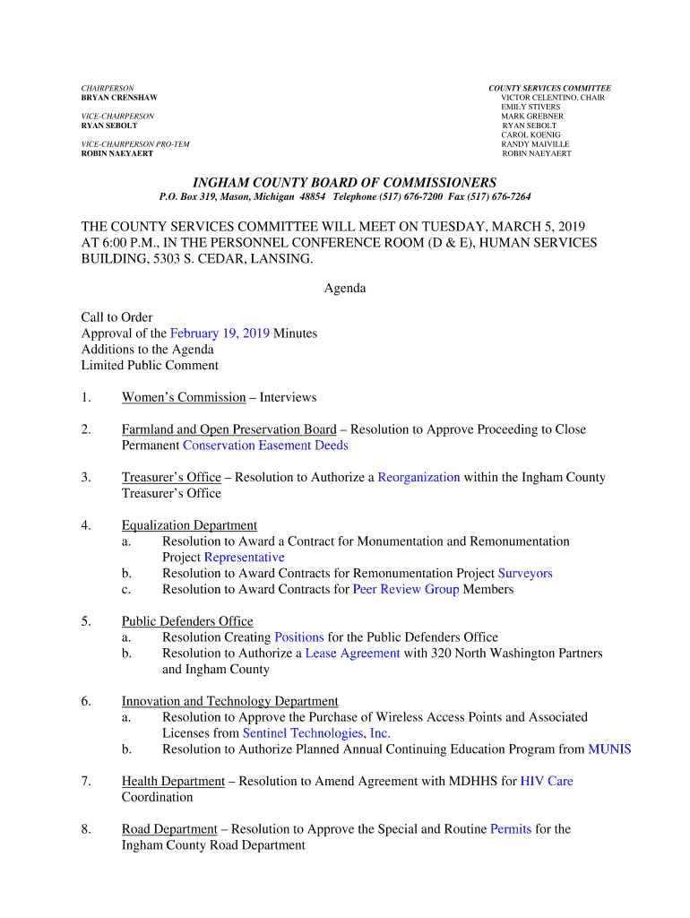 CHAIRPERSON BRYAN CRENSHAWCOUNTY SERVICES COMMITTEE VICTOR VALENTINO, CHAIR EMILY SHIVERS MARK GREENER RYAN SEB OLT CAROL KOENIG RANDY DANVILLE ROBIN NAEYAERTVICECHAIRPERSON RYAN SEB OLT VICECHAIRPERSON