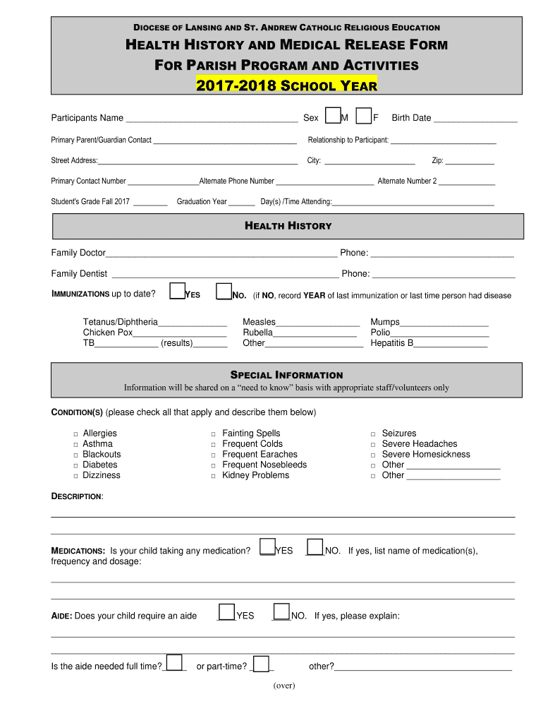 DIOCESE OF LANSING AND ST. ANDREW CATHOLIC RELIGIOUS EDUCATIONHEALTH HISTORY AND MEDICAL RELEASE FORM FOR PARISH PROGRAM AND ACTIVITIES 20172018 SCHOOL YEAR Participants Name SexMFBirth Date Primary