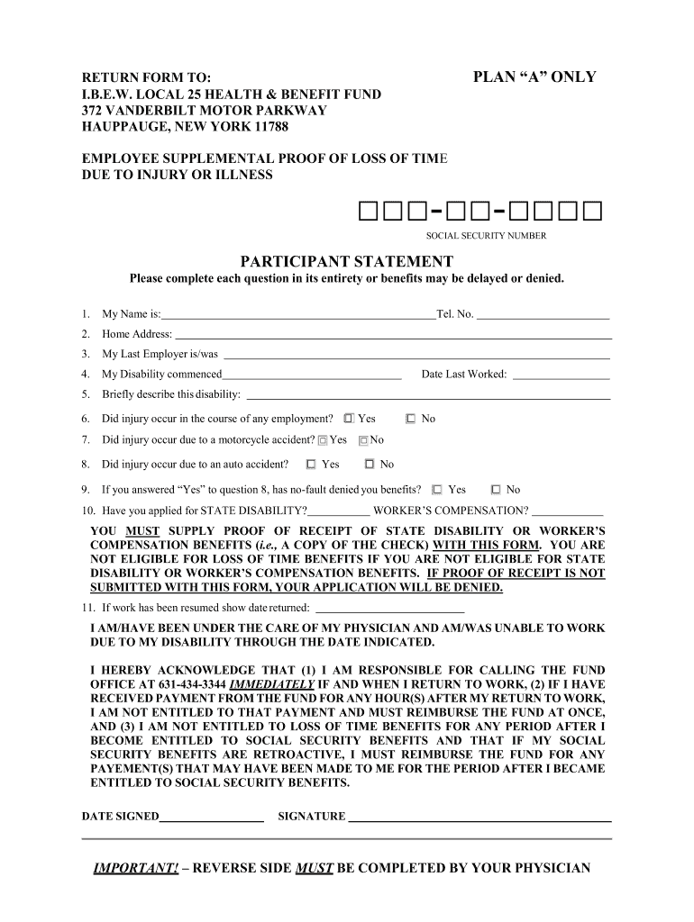 PLAN A ONLYRETURN FORM TO: I.B.E.W. LOCAL 25 HEALTH & BENEFIT FUND 372 VANDERBILT MOTOR PARKWAY HAULAGE, NEW YORK 11788 EMPLOYEE SUPPLEMENTAL PROOF OF LOSS OF TIME DUE TO INJURY OR ILLNESS SOCIAL