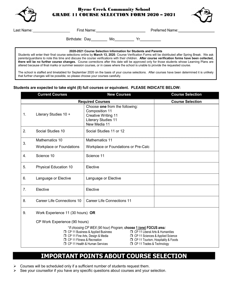 Get the free Byrne Creek Community School GRADE 11 COURSE SELECTION FORM ...