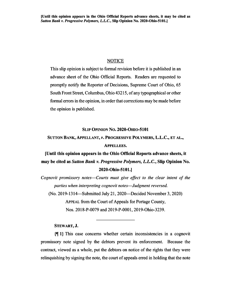 Until this opinion appears in the Ohio Official Reports advance sheets, it may be cited as Sutton Bank v. Progressive Polymers, L.L.C., Slip Opinion No. 2020Ohio5101. NOTICE This slip opinion is subject
