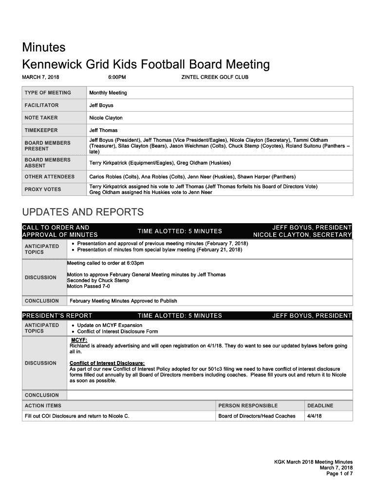 Minutes Kennewick Grid Kids Football Board Meeting MARCH 7, 20186:00PMZINTEL CREEK GOLF SUBTYPE OF MEETINGMonthly MeetingFACILITATORJeff BoyusNOTE TAKER Nicole ClaytonTIMEKEEPERJeff ThomasBOARD MEMBERS