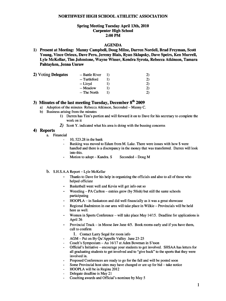 NORTHWEST HIGH SCHOOL ATHLETIC ASSOCIATION Spring Meeting Tuesday, April 13th, 2010 Carpenter High School 2:00 PM AGENDA 1) Present at Meeting: Many Campbell, Doug Milne, Darren Nor dell, Brad Freeman,