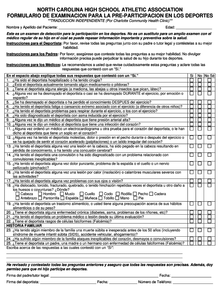 NORTH CAROLINA HIGH SCHOOL ATHLETIC ASSOCIATION FORMULA RIO DE EXAMINATION PARA LA PREPARTICIPACION EN LOS DEPORTED **PRODUCTION INDEPENDENT (POR Charlotte Community Health Clinic)** Hombre y Adelaide