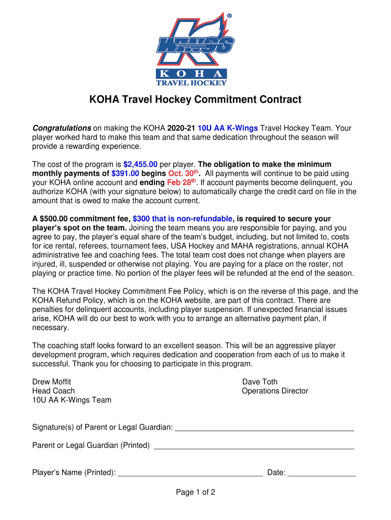 Players and their families involved in the Koha travel hockey program are typically required to file the travel hockey commitment.