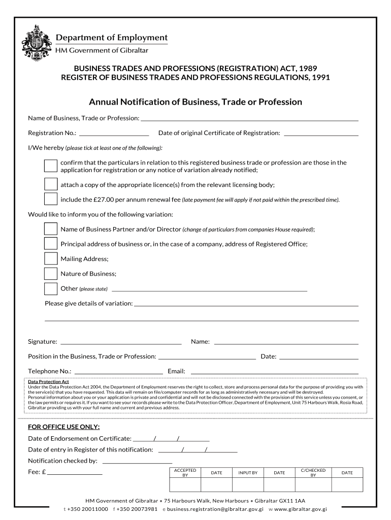 REGISTER OF BUSINESS TRADES AND PROFESSIONS REGULATIONS, 1991Annual Notification of Business, Trade or Profession