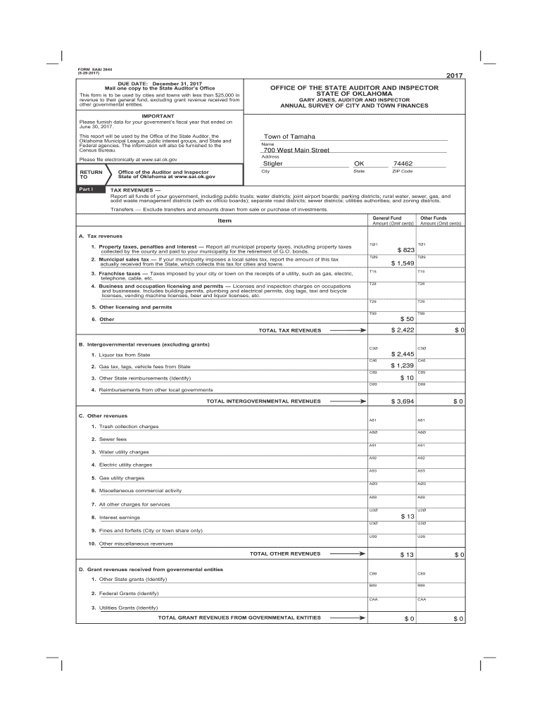 FORM SARI 2644 (8292017)2017DUE DATE: December 31, 2017, Mail one copy to the State Auditors Office This form is to be used by cities and towns with less than $25,000 in revenue to their general fund,