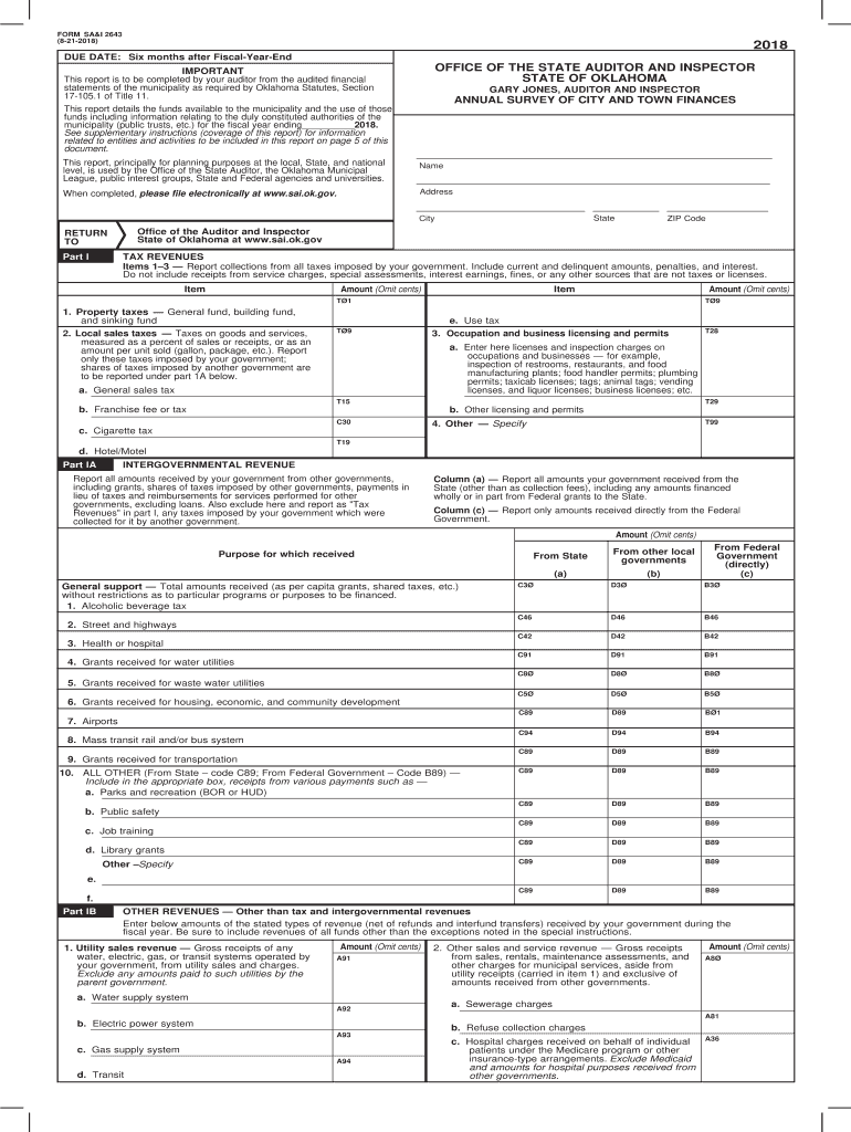 FORM SARI 2643 (8212018)2018DUE DATE: Six months after FiscalYearEndOFFICE OF THE STATE AUDITOR AND INSPECTOR STATE OF OKLAHOMAIMPORTANT This report is to be completed by your auditor from the audited