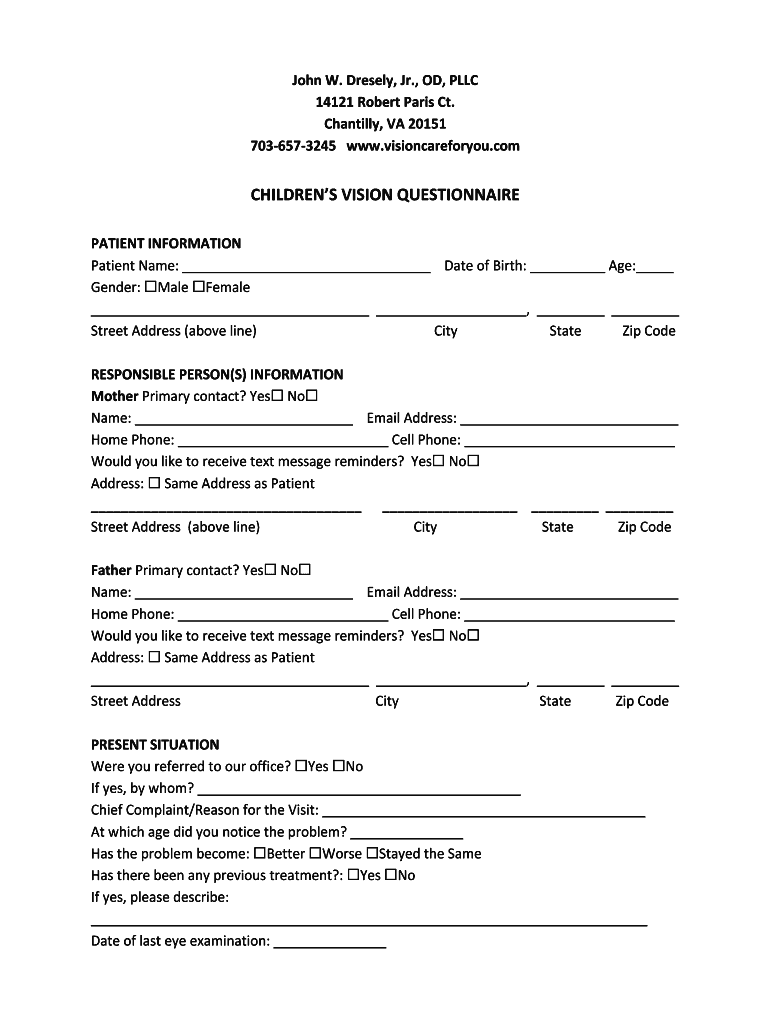 John W. Diesel, Jr., OD, LLC 14121 Robert Paris Ct. Chantilly, VA 20151 7036573245 www.visioncareforyou.comCHILDRENS VISION QUESTIONNAIRE PATIENT INFORMATION Patient Name: Date of Birth: Age: Gender: