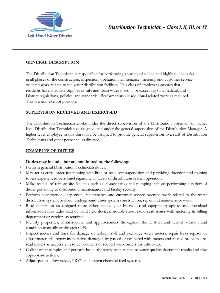 Distribution Technician Class I, II, III, or GENERAL DESCRIPTION The Distribution Technician is responsible for performing a variety of skilled and highly skilled tasks in all phases of the construction,