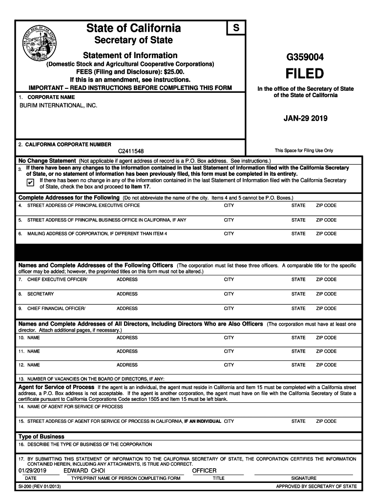 Get the free Filing For BURIM INTERNATIONAL, INC.. Statement of Information