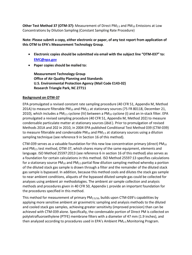 Other Test Method 37 (OTM37): Measurement of Direct PM2.5 and PM10 Emissions at Low Concentrations by Dilution Sampling (Constant Sampling Rate Procedure) Note: Please submit a copy, either electronic