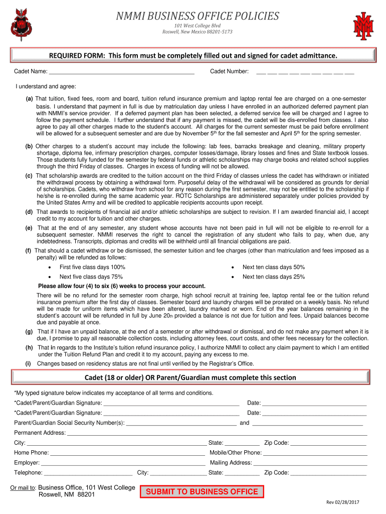 MMI BUSINESS OFFICE POLICIES101 West College Blvd Roswell, New Mexico 882015173REQUIREDFORM:Thisformmustbecompletelyfilledoutandsignedforcadetadmittance. Cadet Name: Cadet Number: I understand and